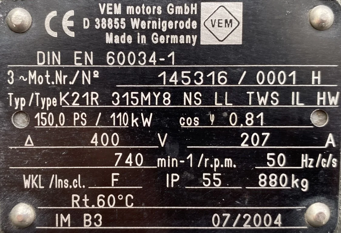 Trójfazowy silnik elektryczny VEM wyróżnia się solidną konstrukcją i wysoką kulturą pracy, charakterystyczną dla produktów tego producenta. Wielkość mechaniczna 315 zapewnia stabilność montażu oraz doskonałe dopasowanie do standardowych przekładni i sprzęgieł przemysłowych. Średnica wału wynosząca 80 mm gwarantuje pewne przeniesienie momentu obrotowego nawet w warunkach dużych obciążeń dynamicznych, co czyni ten silnik idealnym wyborem do pracy ciągłej w trudnych warunkach przemysłowych.