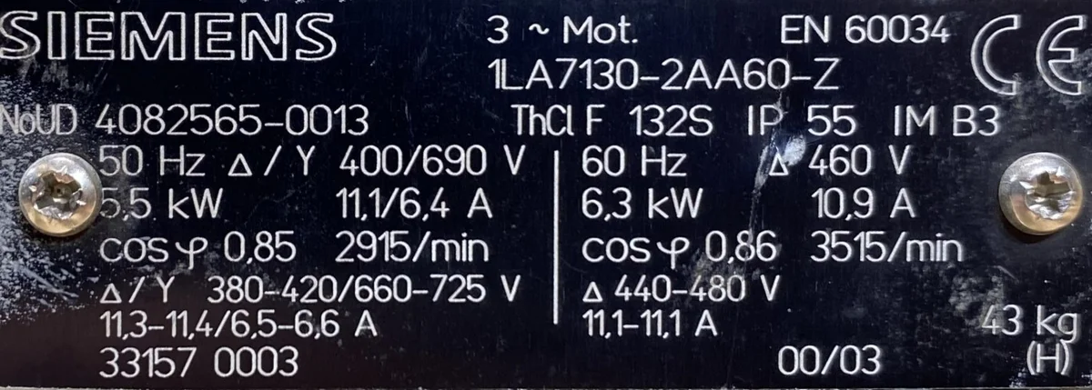Prezentowany silnik elektryczny trójfazowy marki Siemens o mocy 5,5 kW to sprawdzone rozwiązanie dla wymagających aplikacji przemysłowych. Urządzenie pracuje z prędkością obrotową wynoszącą 2915 obr/min, co czyni je idealnym wyborem do napędu pomp, wentylatorów, sprężarek, przenośników taśmowych oraz obrabiarek. Silniki Siemens od lat cieszą się opinią jednych z najbardziej niezawodnych i trwałych jednostek napędowych dostępnych na rynku, a ich wysoka jakość wykonania sprawia, że doskonale sprawdzają się zarówno w ciągłej pracy produkcyjnej, jak i w zastosowaniach wymagających częstych rozruchów.